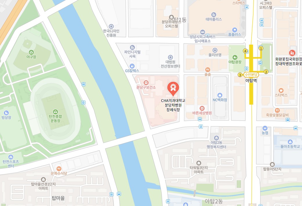분당차병원은 야탑역 3번 출구를 나오면 바로 있습니다. 내비를 이용하면 '분당차병원' 찍으시면 되십니다. 탄천종합운동장 건너편입니다. 출퇴근 시간 대면 차로 이동시 조금 막히기도 합니다.