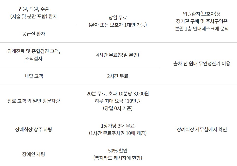 외래 진료, 종합검진 고객은 당일 본인에 한해 4시간 무료입니다.