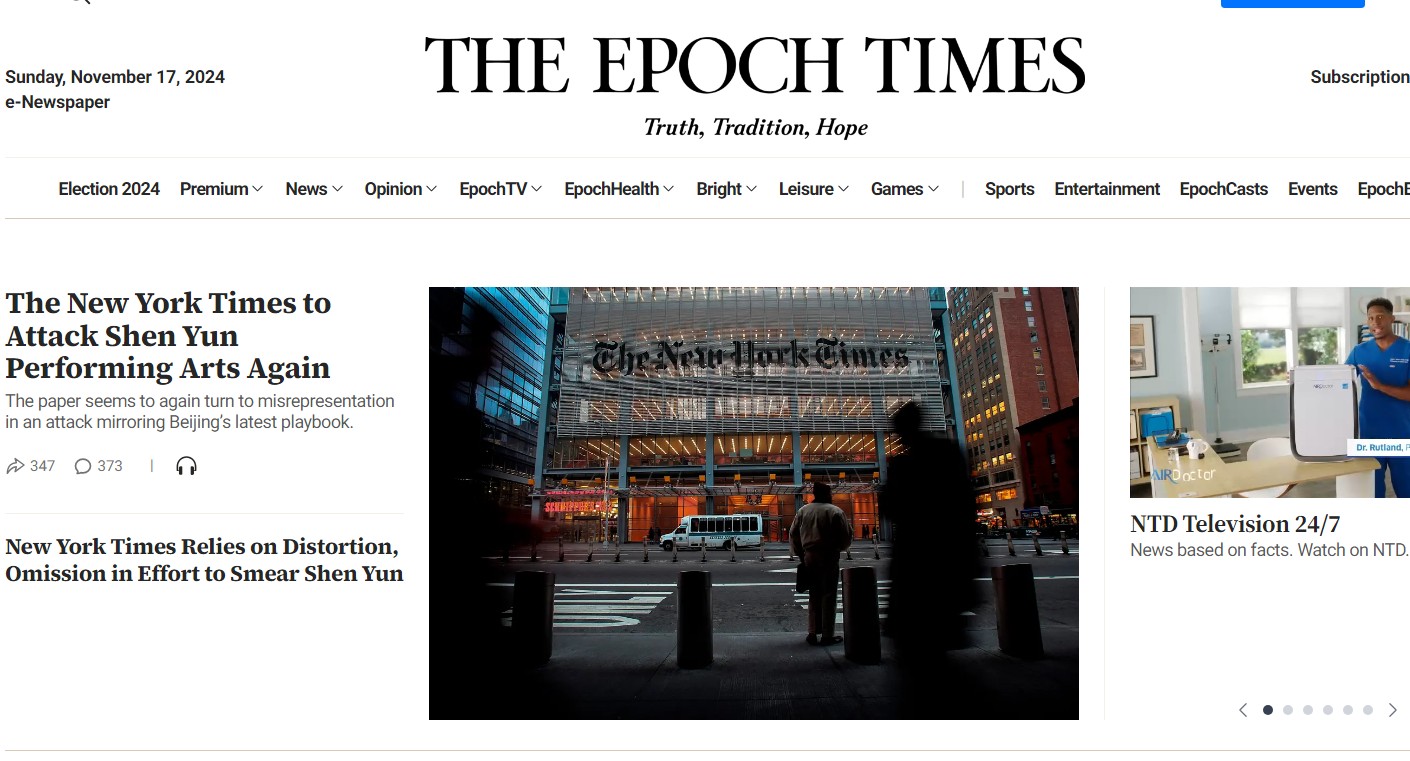 현존 최고의 중국 예술단체인 션윈예술단을 공격하는 기사를 뉴욕타임스가 내보냈다. 사진은 이 사건을 다룬 에포크타임스 기사 캡처.