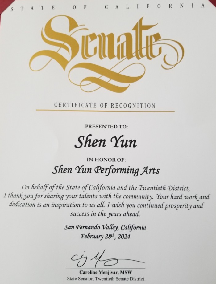 캘리포니아주 상원의원 레나 곤잘레스(Lena Gonzalez)는 션윈예술단에 보낸 표창장에서 다음과 같이 밝혔다. “중국공산당 통치하에서 대부분 파괴된 5천 년 전통의 중국 문화와 예술 및 전통 가치를 되살리는 션윈예술단의 사명에 찬사를 보냅니다. 캘리포니아 제33선거구를 대표해 이 중대한 행사를 축하합니다.”