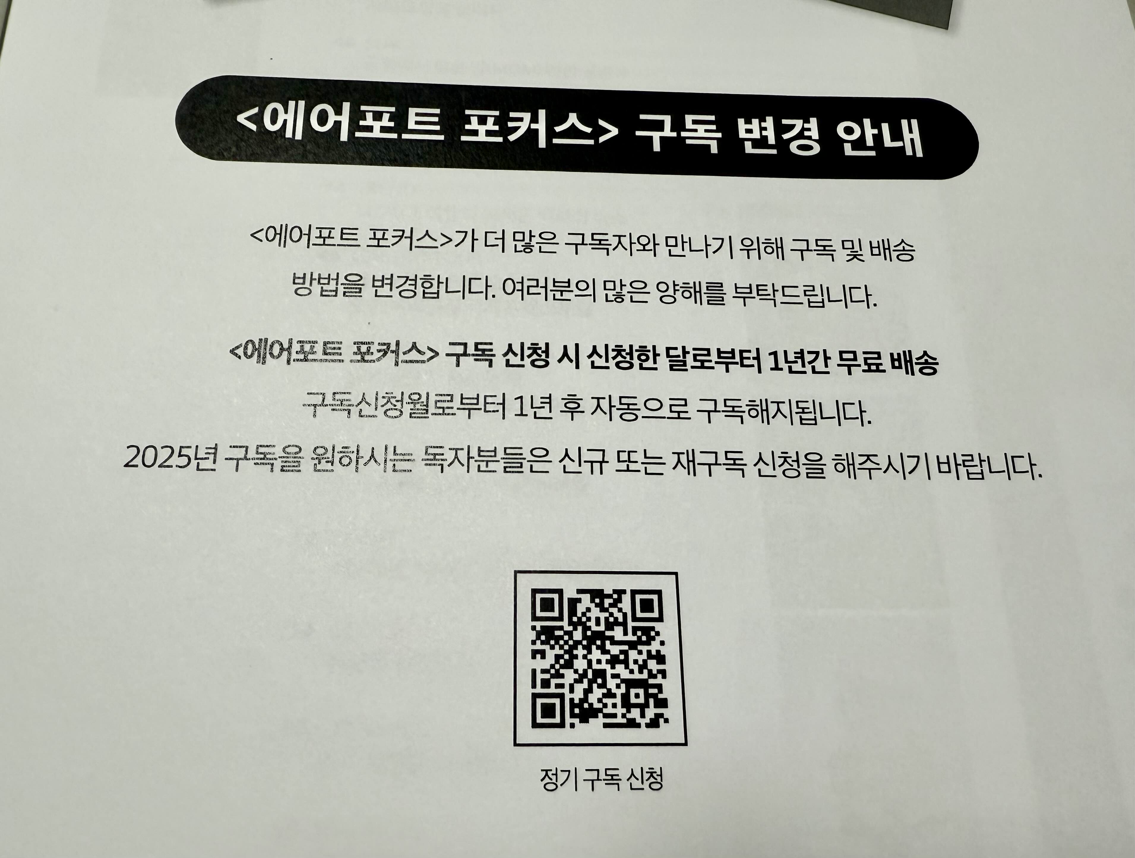 에어포트 포커스가 2025년부터 구독방법이 변경됩니다. 구독 신청 시 신청한 달로부터 1년간 무료배송되고, 구독신청월부터 1년 후 자동으로 구독해지가 됩니다.