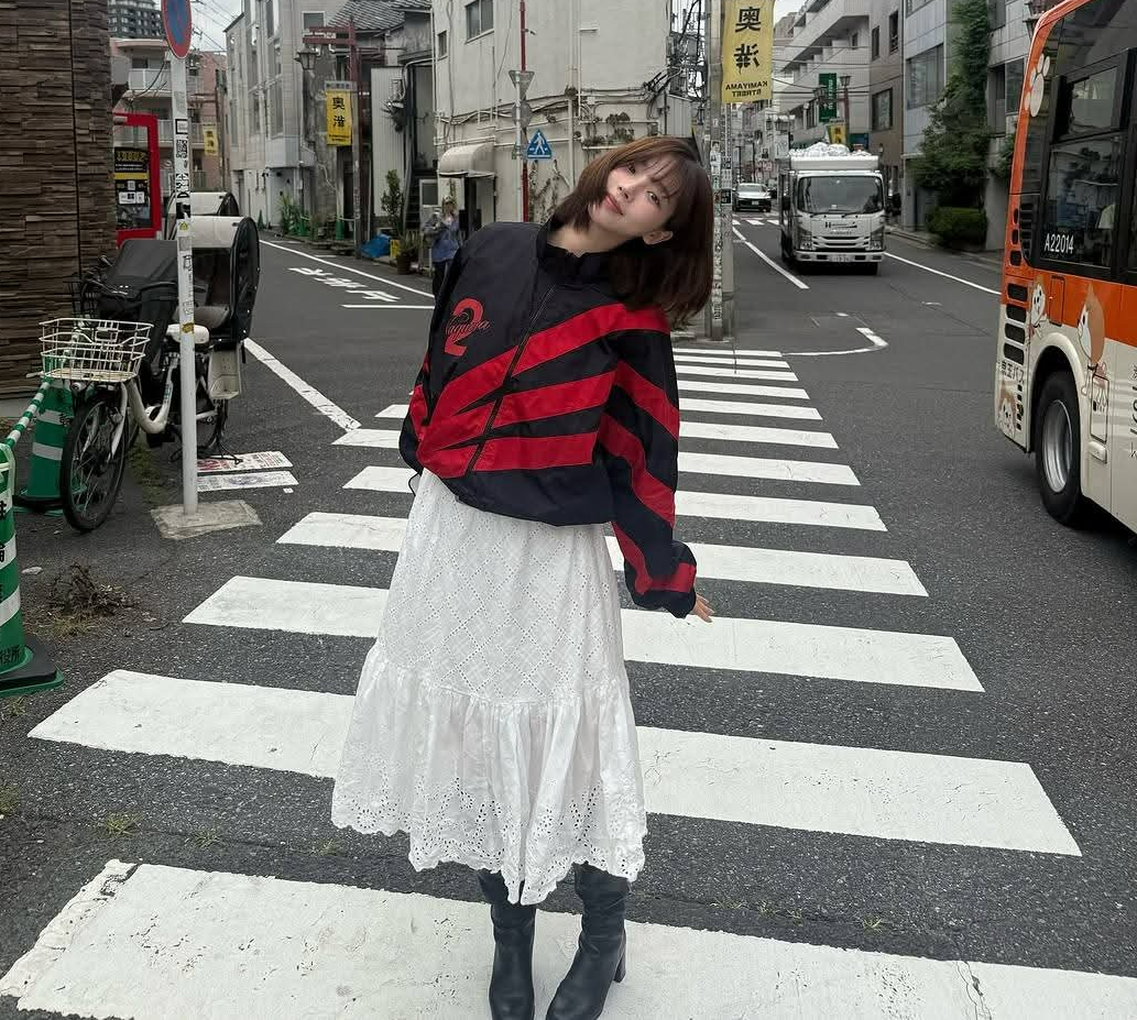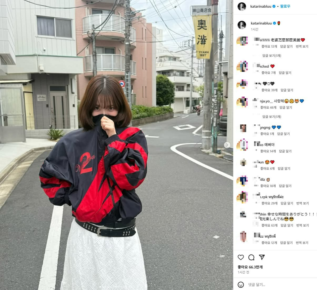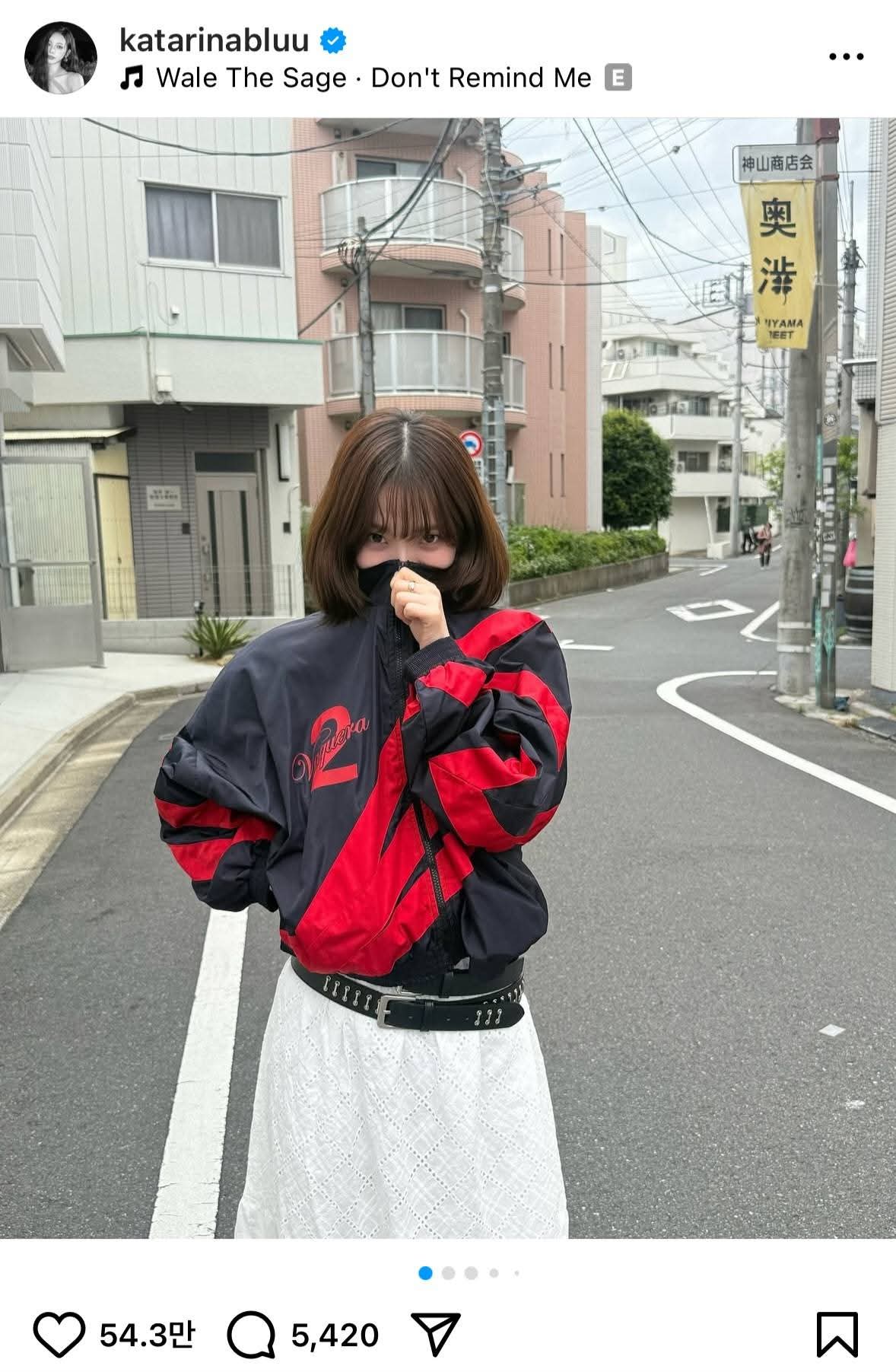 일본 여행 중에 한 장을 사진을 올렸는데요. 독특한 디자인의 점퍼-바람막이를 입고 정면을 응시하는 사진입니다.