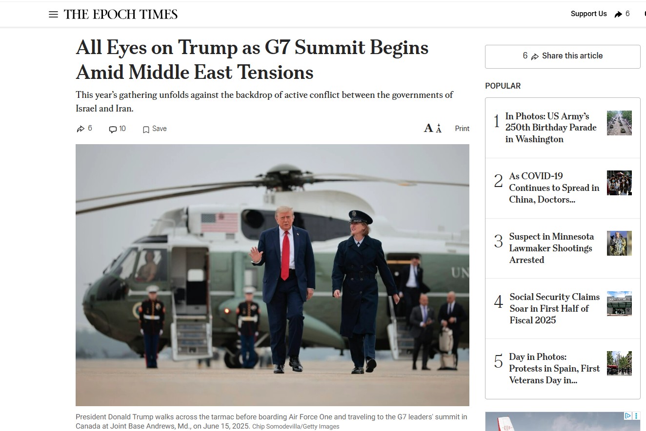 도널드 트럼프 대통령이 2025년 6월 15일 메릴랜드주 앤드루스 공동기지에서 열리는 G7 정상회담에 참석하기 위해 에어포스원에 탑승하기 전 활주로를 걷고 있다. 에포크타이스 캡처.