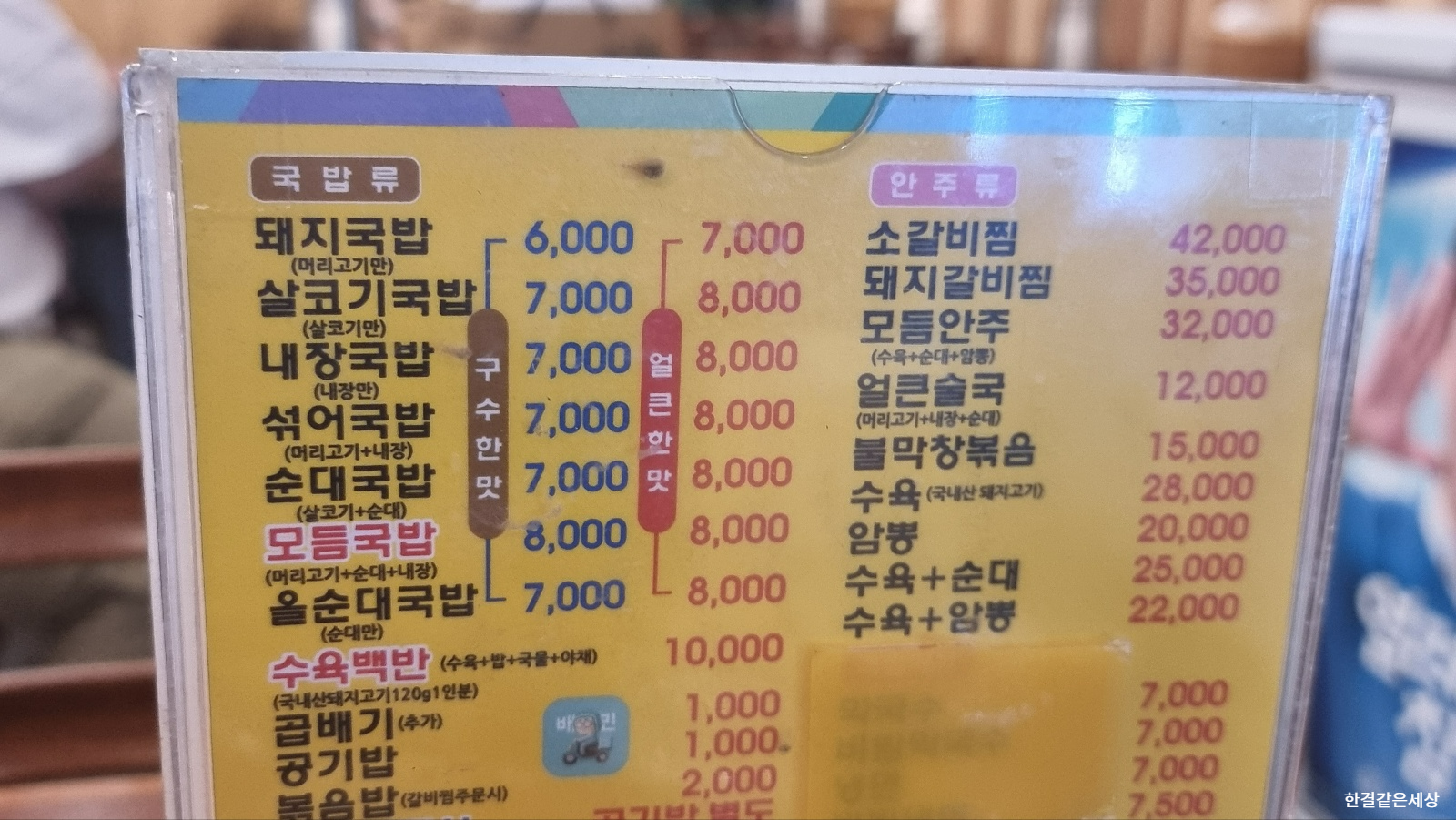 국밥이 나오고 테이블 위에 놓인 메뉴판을 보게 되었습니다.
