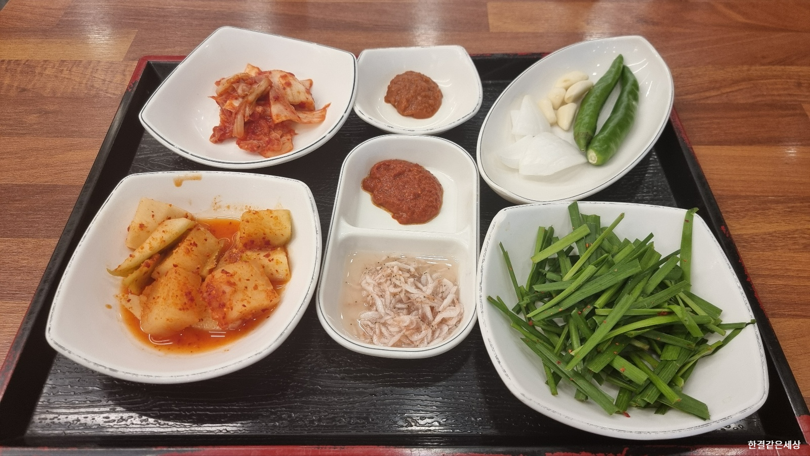 밑반찬이 먼저 나오고요. 저 부추는 참 신선합니다. 고추는 살짝 메워서 하나만 먹었습니다.