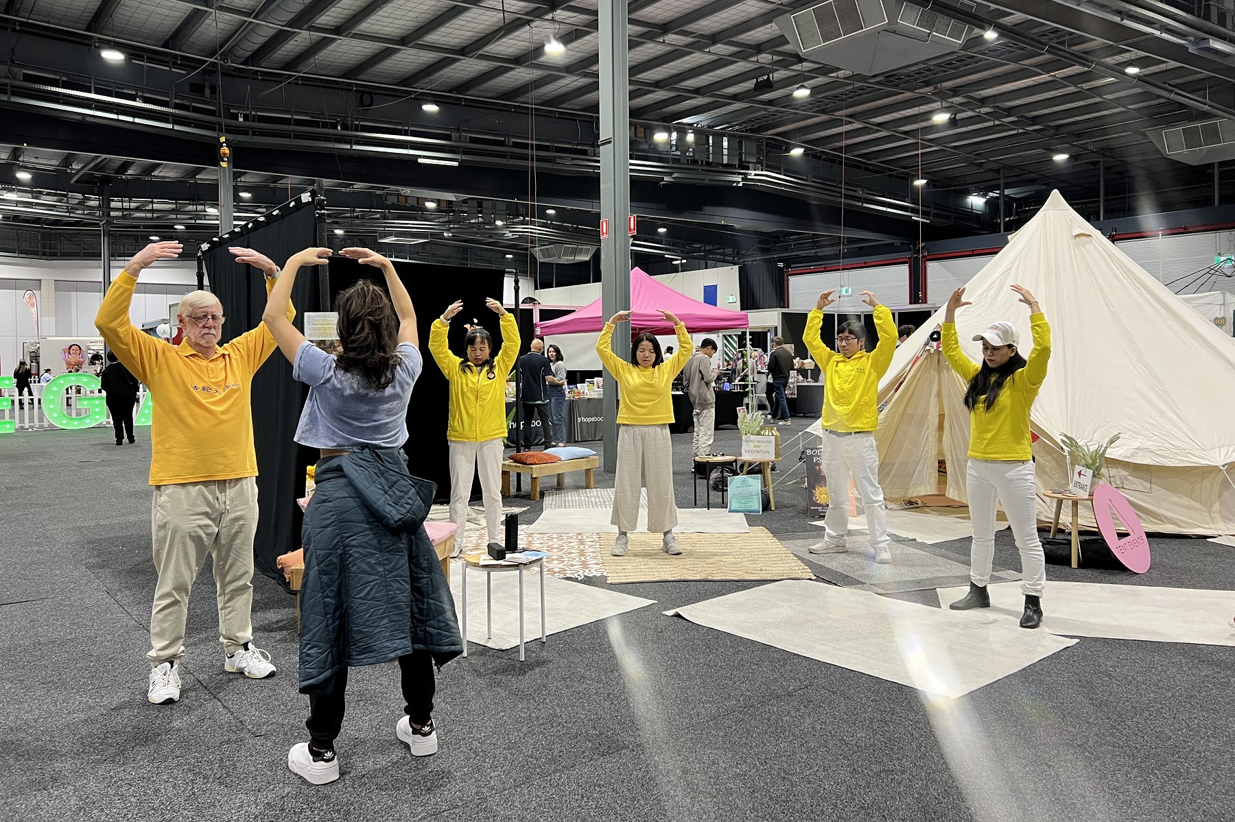 매일 오후, 주최 측은 수련자들이 강연 구역에서 파룬궁을 소개하고 현장에서 동작을 가르치도록 배치했다.